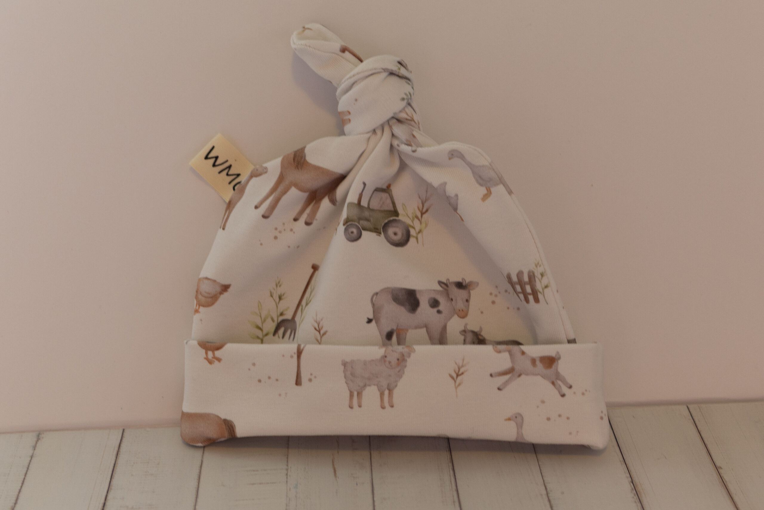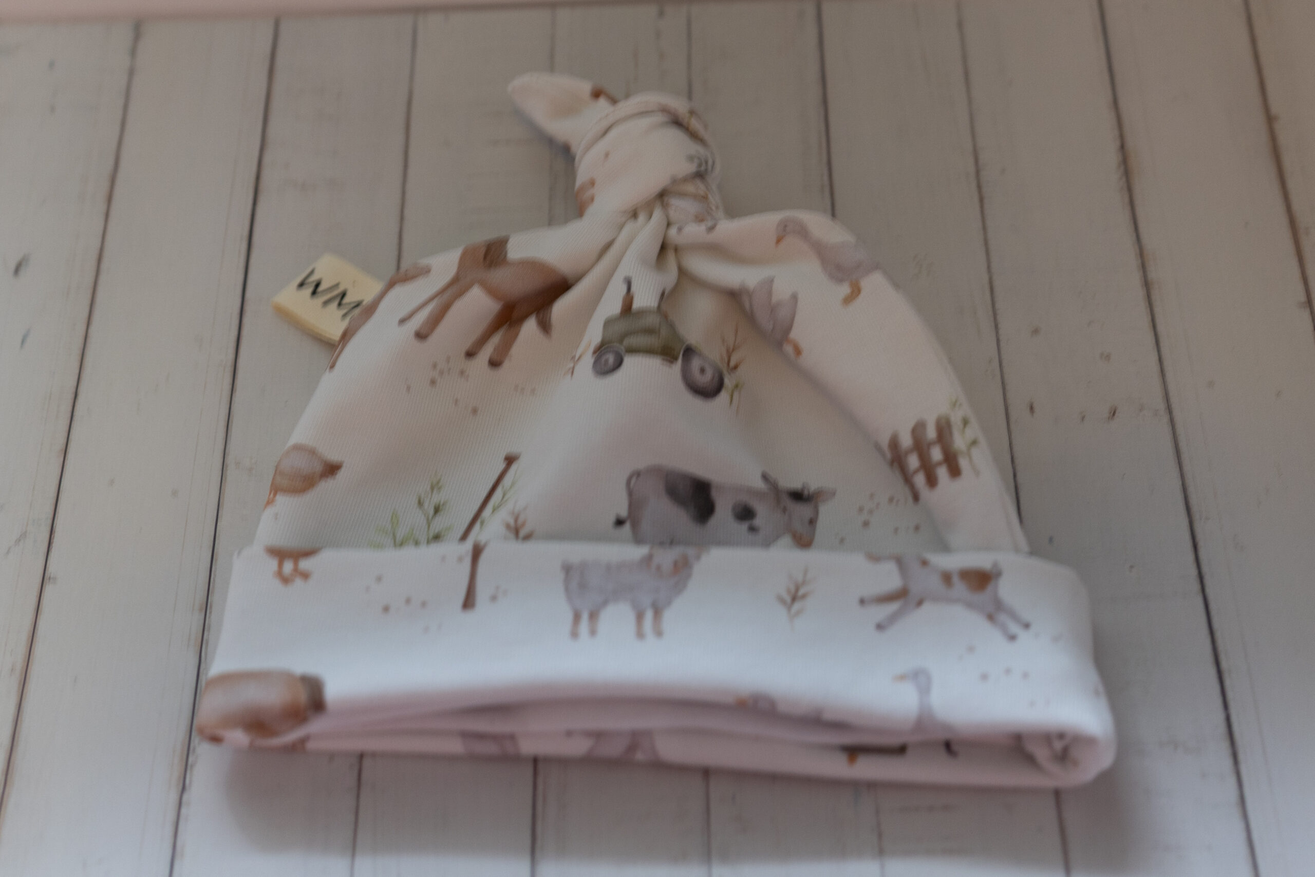 Een lief Newbornpakket 3 met een zacht mutsje en een gehaakte rammelaar. Handgemaakt door WMC With Love, met mogelijkheid om de stofjes en kleuren zelf uit te kiezen. Perfect als kraamcadeau of voor de eerste babyuitzet.